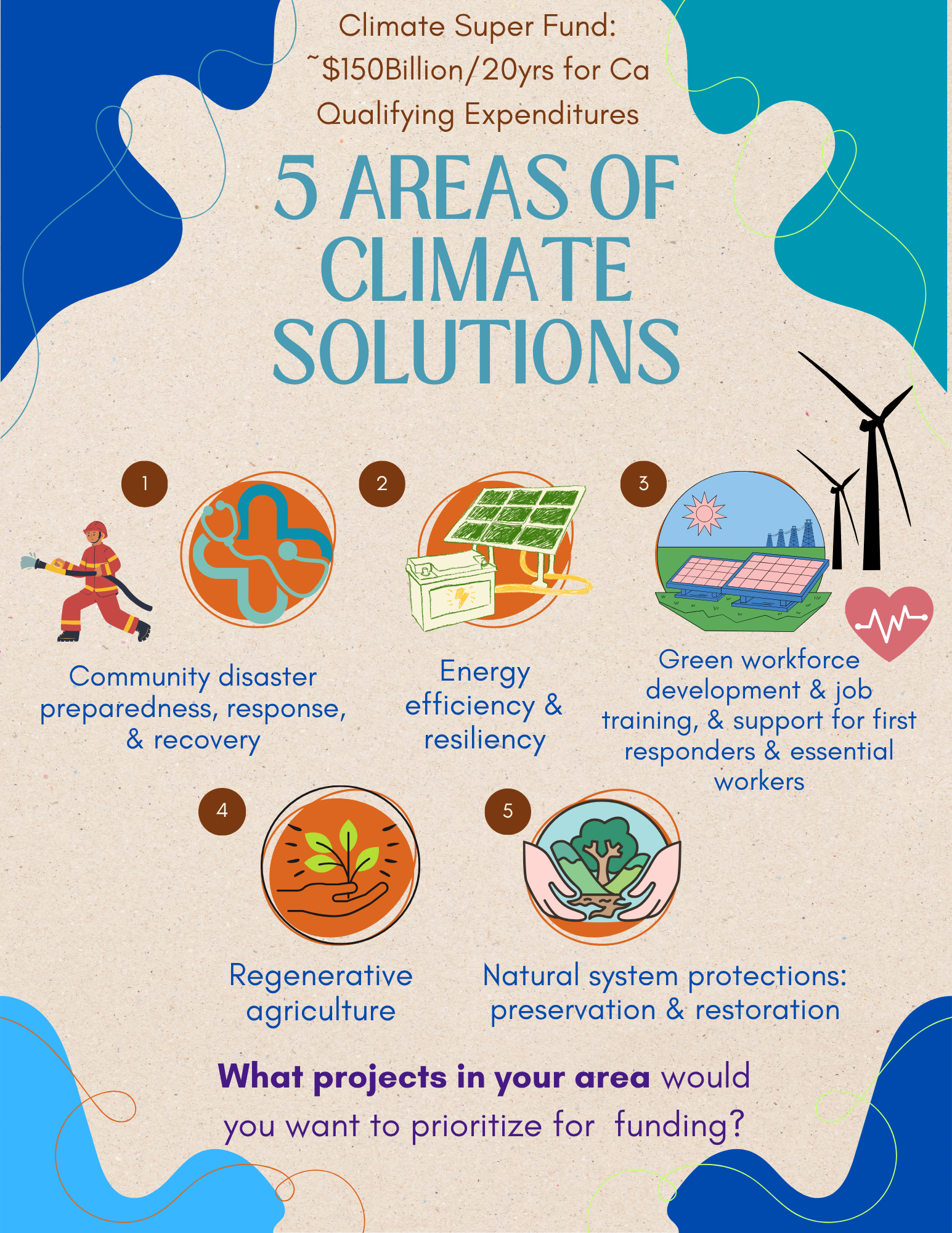 Join us for a social potluck and conversation at Los Cerritos Community Center, focused on what 'climate solutions' really mean, what the 5 categories Qualifying Expenditures are for the climate superfund and how we'd each most want to invest in our Alameda County + Fremont area community with the (billions of dollars) that the climate superfund revenues could generate! It's sure to be a fun and meaningful gathering and everyone in the area is welcome to join!